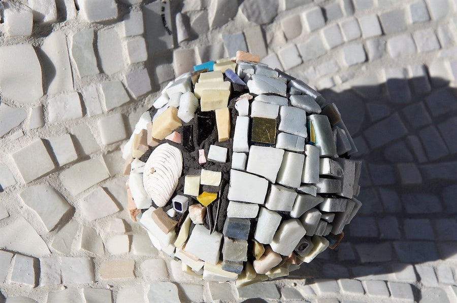 Join our Mosaic class for beginners or ongoing students to create a marble and glass mosaic globe for your garden or indoor decor. Learn 3D mosaic skills to plan sculptures.